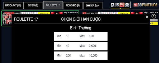 Bấm chọn tiếp game Roulette rồi lựa chọn bàn chơi và giới hạn cược phù hợp. Thông thường sẽ dao động từ 15.000 – 10.000.000 đồng.
